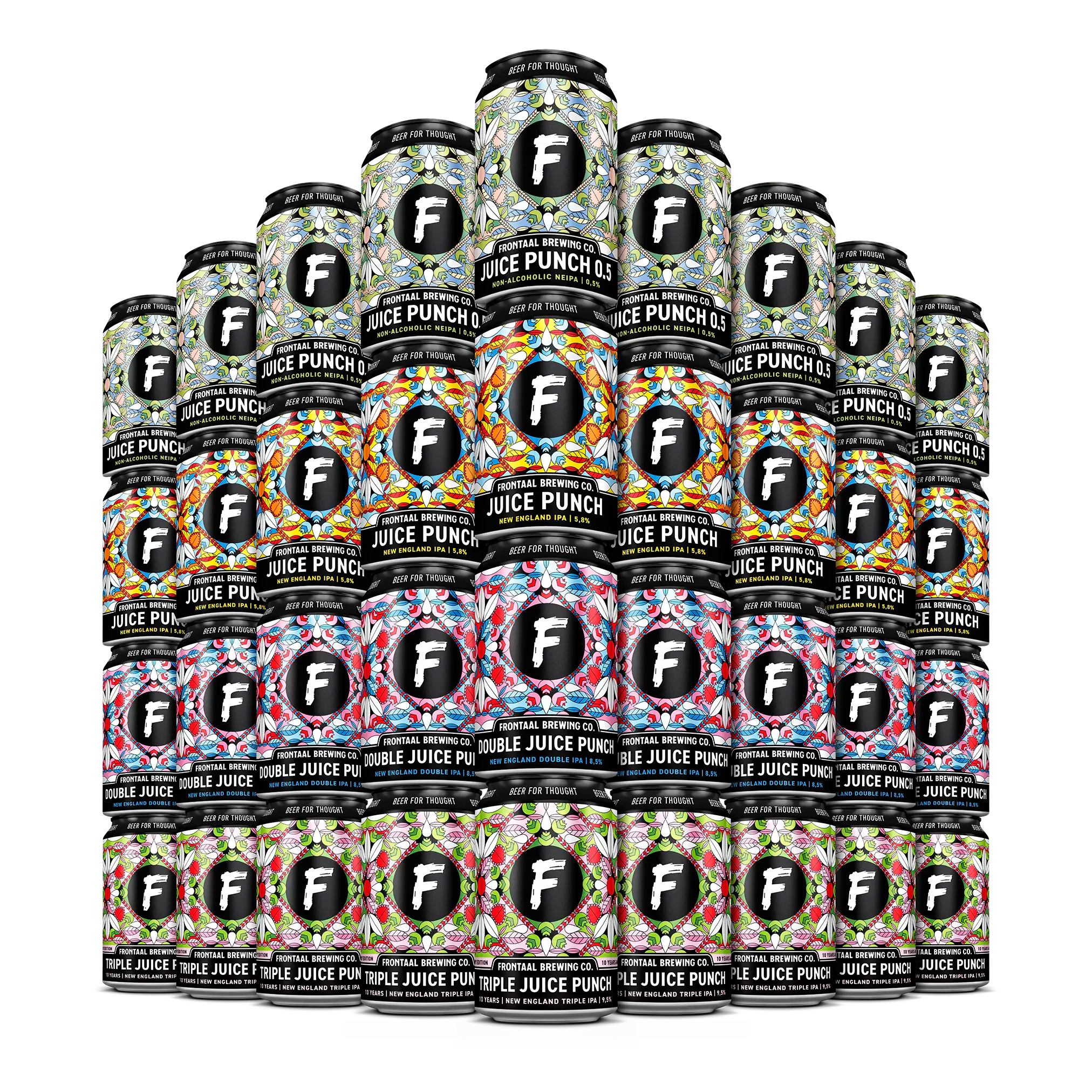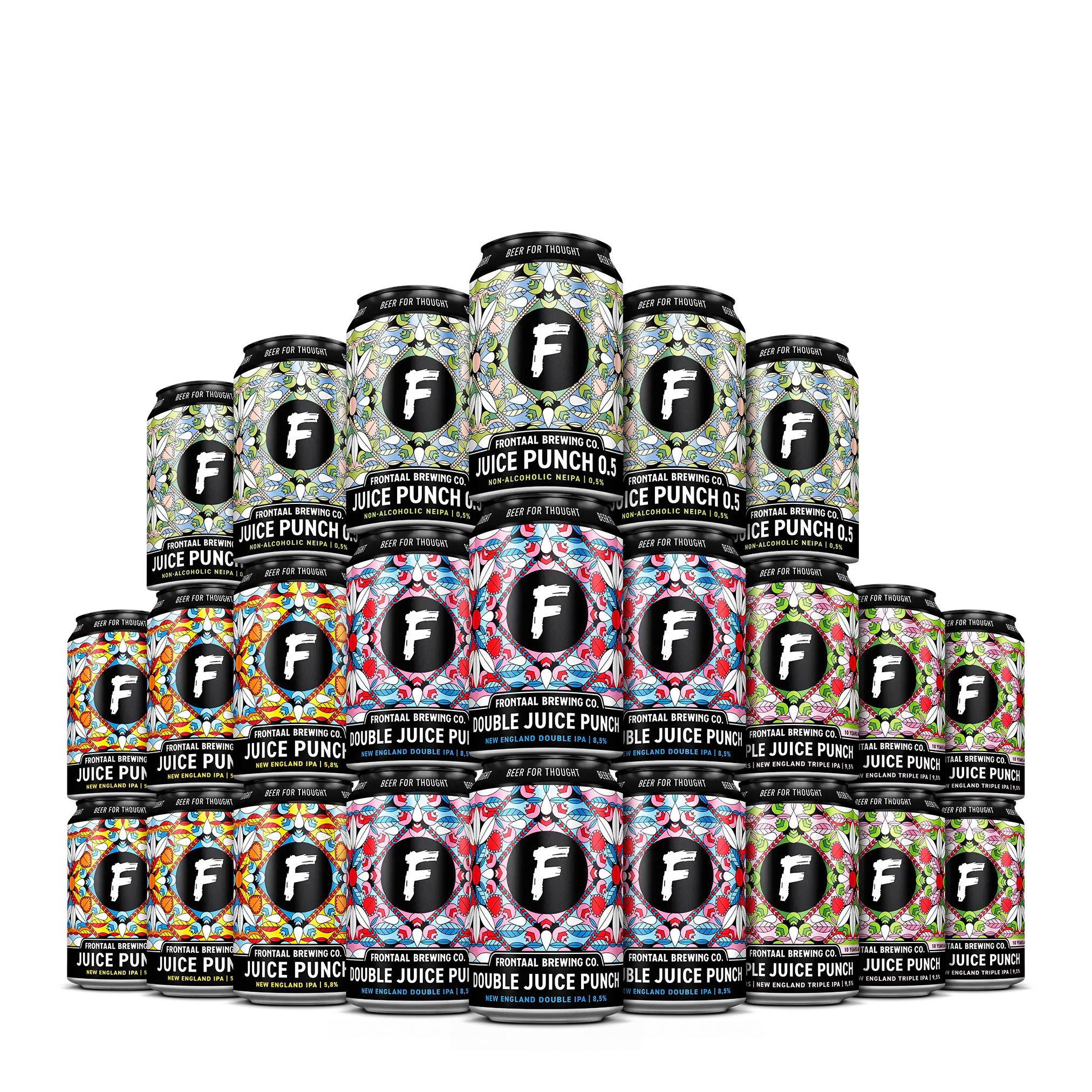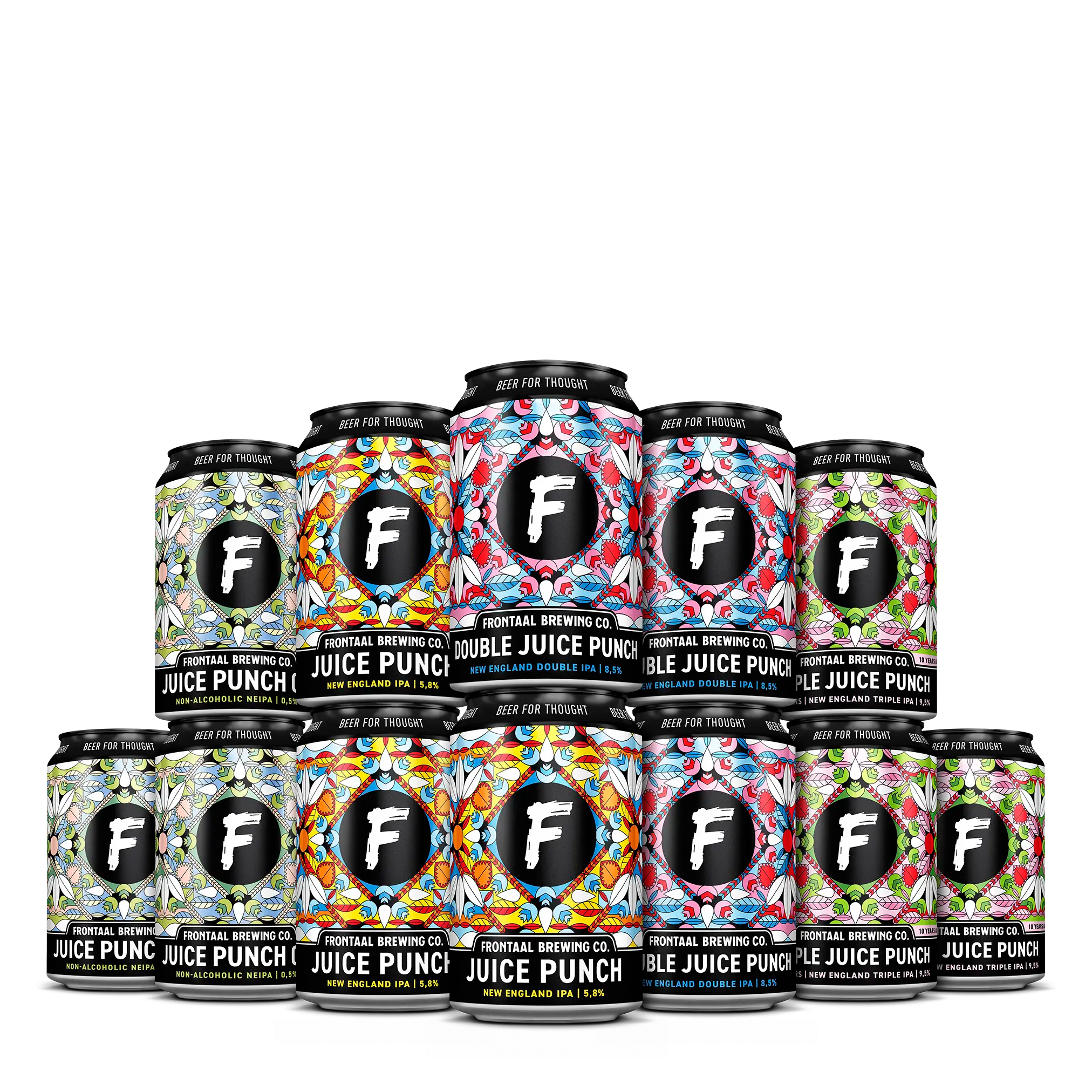 In dit bierpakket vind je 12, 24 of 36 van onze Juice Punch bieren. Ideaal als je soms twijfelt tussen een NEIPA, DIPA of toch een Non-Alcoholische variant! Daarnaast zitten er in de box bijpassende Frontaal onderzetters, perfect om je Frontaal bier op te zetten. Proost!