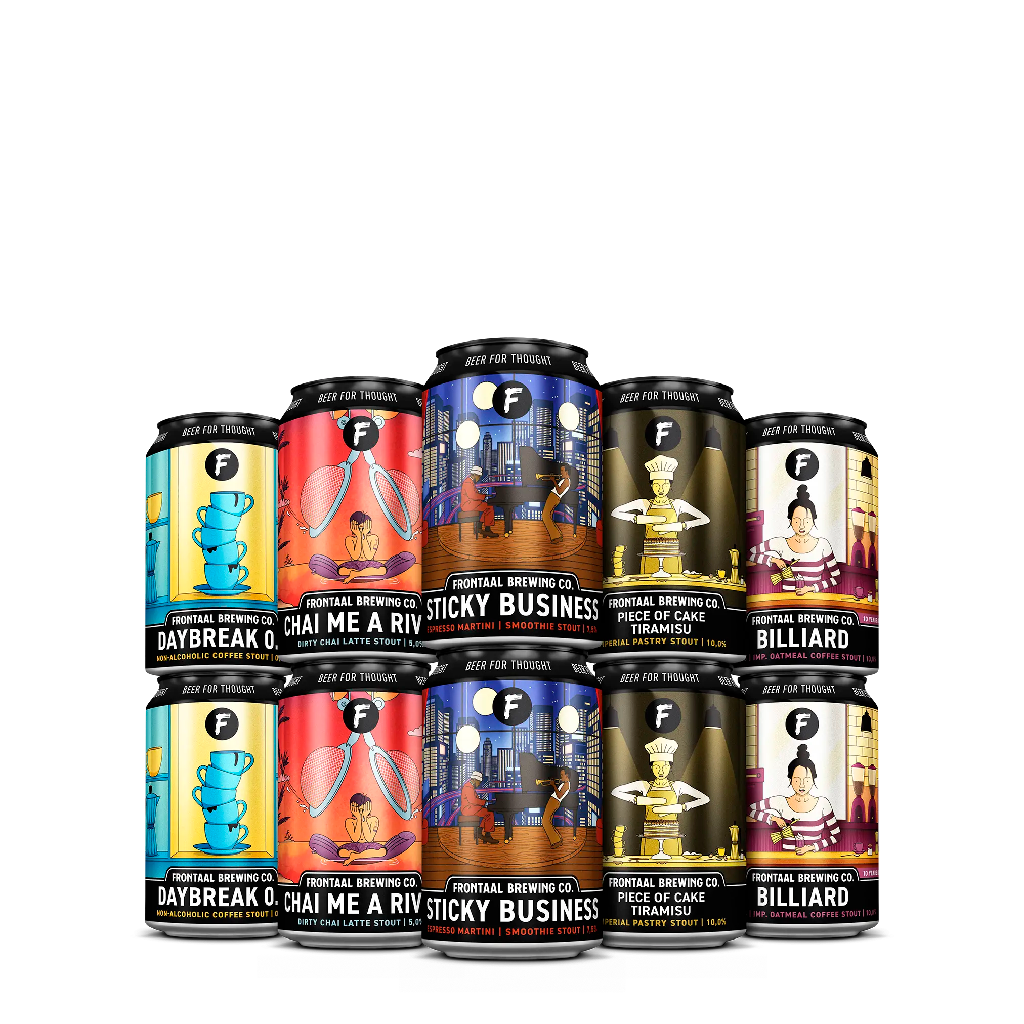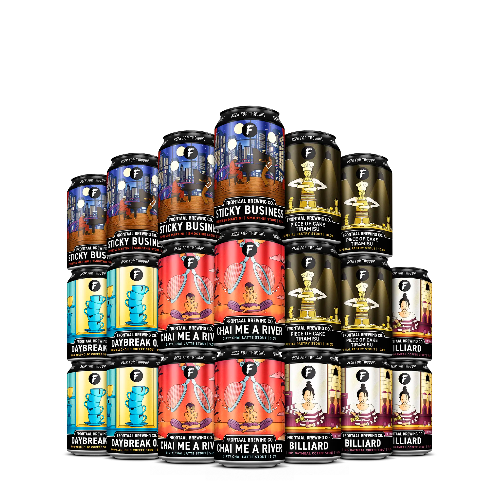 10, 20 of 30 van Frontaal Brewing Company. Vol met bieren die gebrouwen zijn met koffie. Uiteraard maken we je bierpakket compleet met Frontaal viltjes!