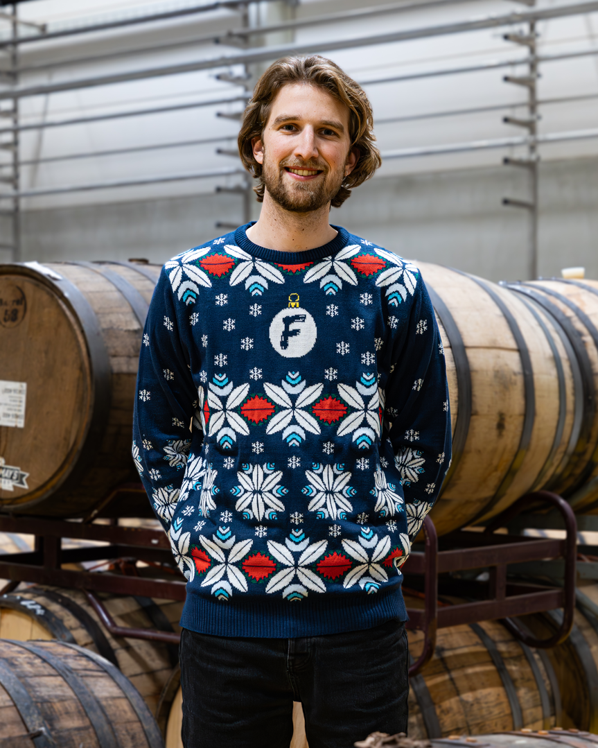 Over de hele kersttrui vind je speelse details die zijn geïnspireerd op de iconische Juice Punch blikjes van Frontaal Brewing Company, uitgevoerd in een sfeervol winters thema en gecombineerd met subtiele sneeuwvlokjes. Op de voorkant van de trui zie je het Frontaal Brewing Company-logo in de vorm van een kerstbal op de borst. Op de bovenrug staan de teksten “Frontaal Brewing Co.”, “Merry Xmas” en “And a hoppy new year”, wat deze trui een humoristisch en echt fout kerstdesign geeft.