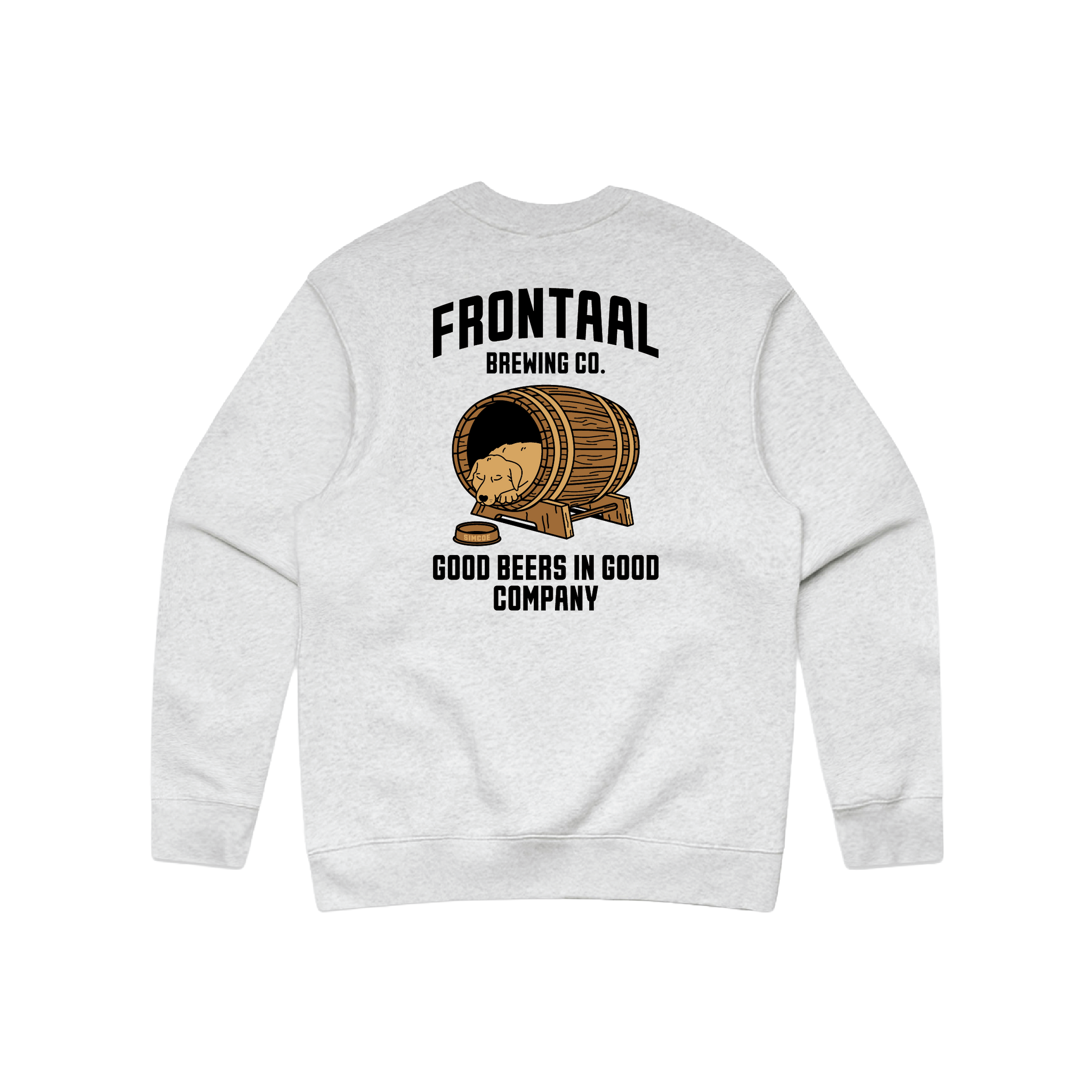 Op de achterkant prijkt een unieke bedrukking van onze trouwe brouwerijhond Simcoe, rustig slapend in een biervat, omringd door 1 van onze onze quotes: "Good Beers in Good Company."
