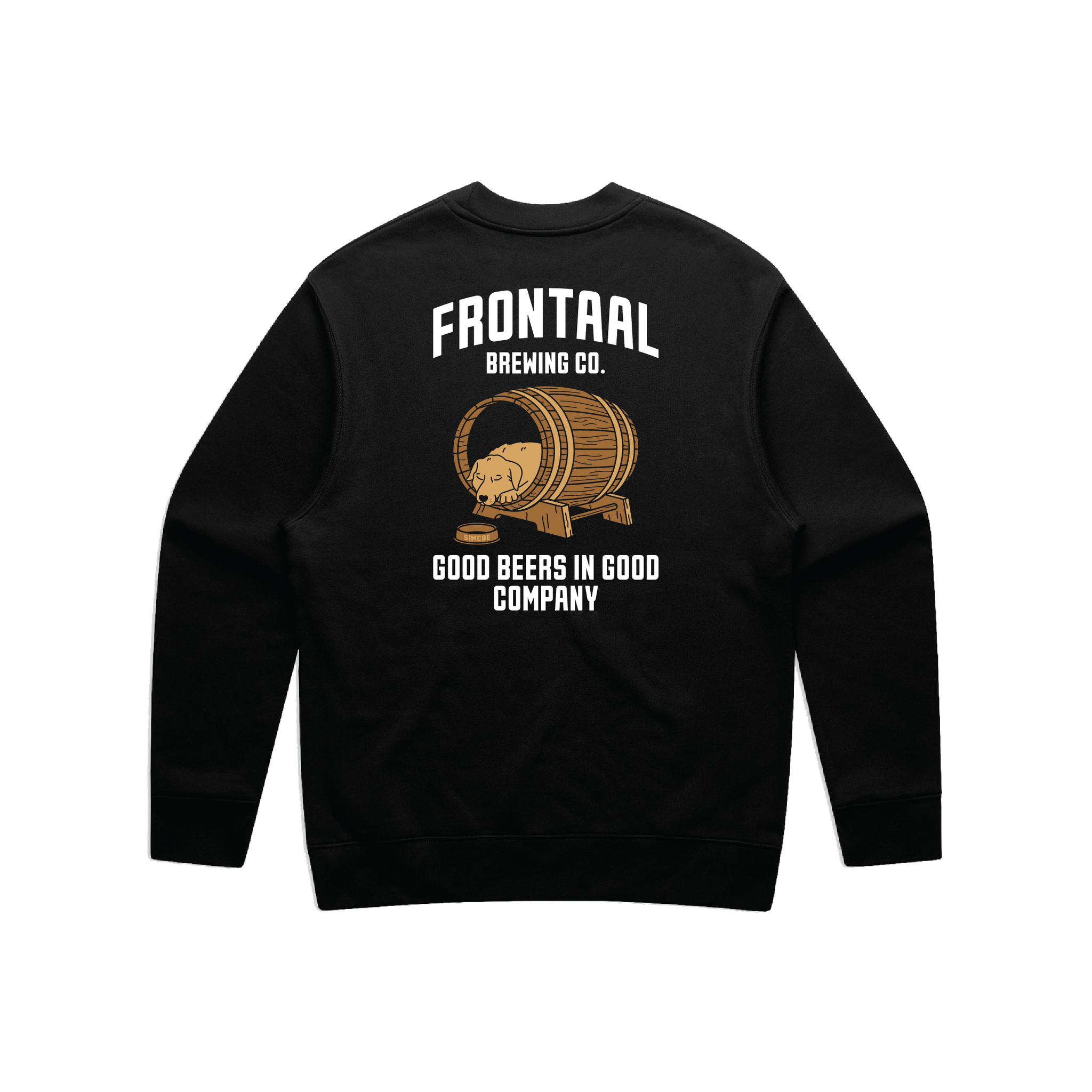 Op de achterkant prijkt een unieke bedrukking van onze trouwe brouwerijhond Simcoe, rustig slapend in een biervat, omringd door 1 van onze onze quotes: "Good Beers in Good Company."